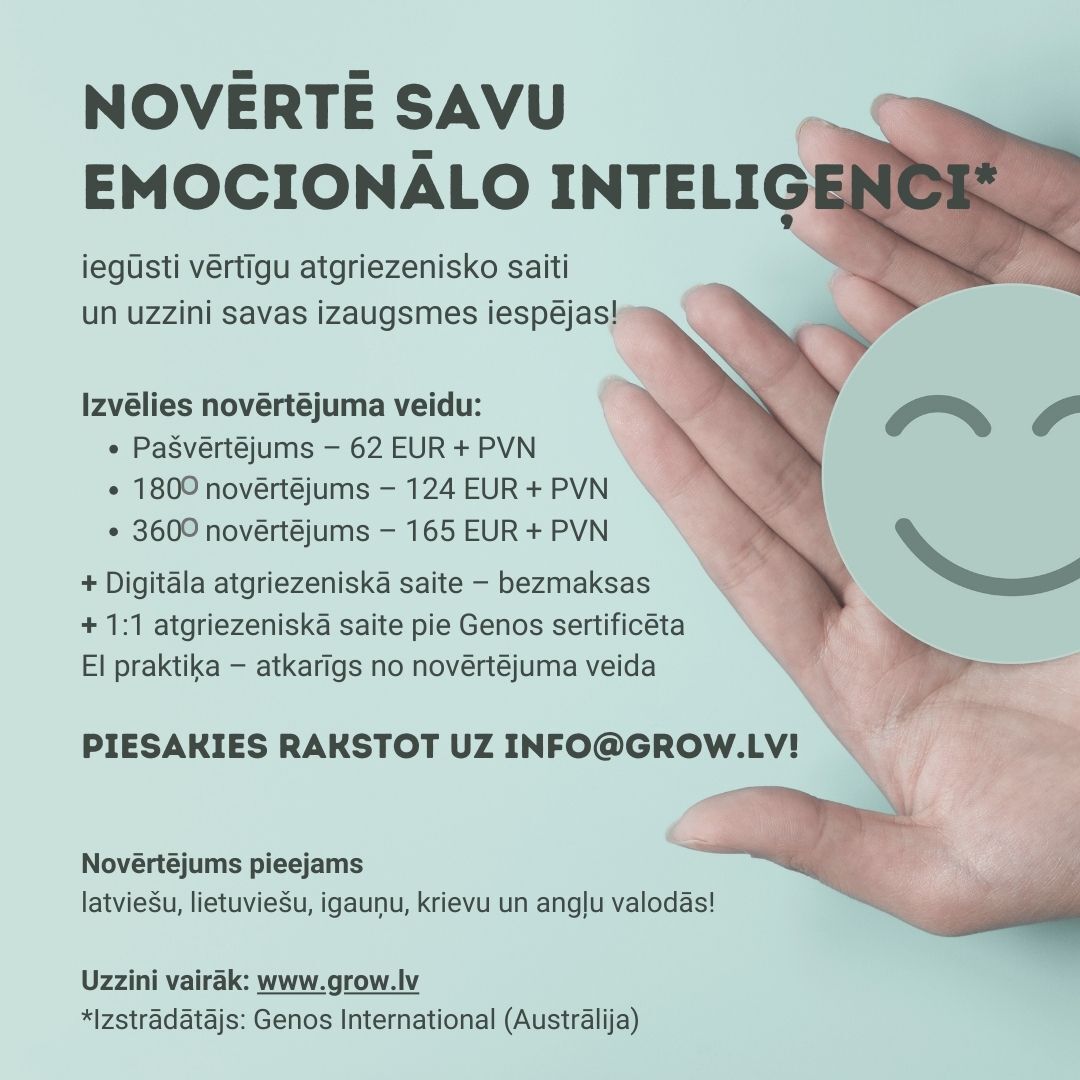 Vēl pavisam nesen daudzi novērtējumi bija pieejami tikai darba vietās, tikai noteiktiem amatiem un pozīcijām. No šī brīža iespēja novērtēt savu emocionālo inteliģenci un iegūt vērtīgu atgriezenisko saiti ir ikvienam, kas to vēlās! Izmanto iespēju! Novērtējumu paraugus vari apskatīt šeit: https://grow.lv/lv/ei-novertejumi/ Piesakies: info@grow.lv!